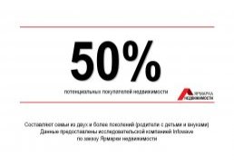 50% потенциальных покупателей строящейся недвижимости составляют семьи с детьми. 3% из них – семьи, состоящие из трех поколений (родители, дети, внуки).